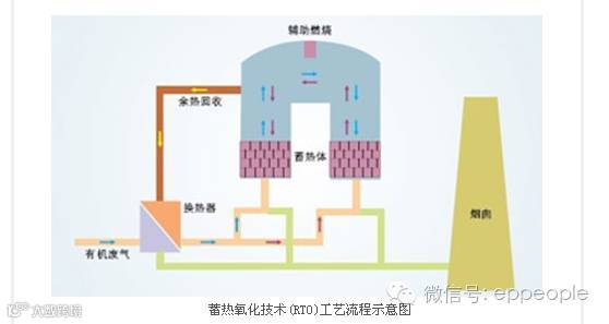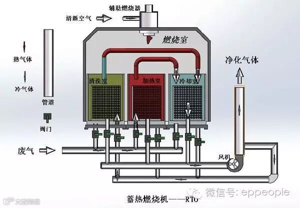 排放自工艺含VOCs的废气进入双槽RTO,三向切换风阀(POPPETVALVE)将此废气导入RTO的蓄热槽(EnergyRecoveryChamber)而预热此废气,含污染的废气被蓄热陶块渐渐地加热后进入燃烧室(CombustionChamber),VOCs在燃烧室被氧化而放出热能于第二蓄热槽中之陶块,用以减少辅助燃料的消耗。陶块被加热,燃烧氧化后的干净气体逐渐降低温度,因此出口温度略高于RTO入口温度。三向切换风阀切换改变RTO出口/入口温度。如果VOCs浓度够高,所放出的热能足够时,RTO即不需燃料。例如RTO热回收效率为95%时,RTO出口仅较入口温度高25℃而已。