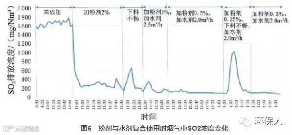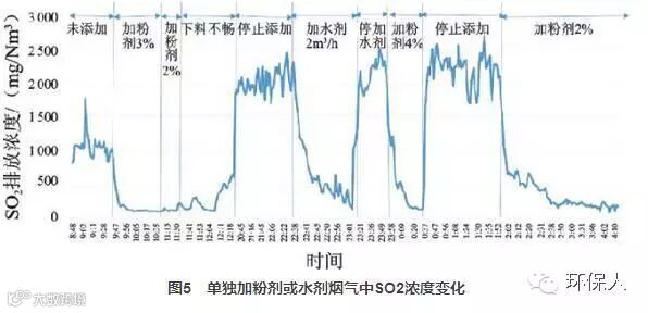 当脱硫水剂单独使用,加剂量为约2m3/h时,烟气中SO2浓度逐渐降低至300~500mg/Nm3,停止添加后,SO2排放浓度约为2000~2500mg/Nm3。