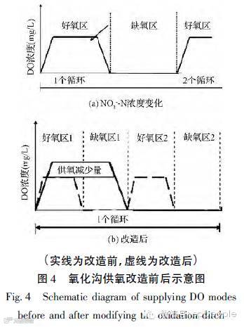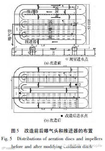 改造前氧化沟的进水点有两处( 见图5( a) 中1和2 处) ,其中进水点2 的功能未充分发挥。通过改造,将进水点2 移动到曝气廊道之后( 图5( b) ) ,以满足进水点在缺氧区起端的基本要求,同时,最大限度地发挥利用原水中的固有碳源( COD) 进行生物脱氮,提高碳源的利用效率和氧化沟的生物脱氮能力,使得后期厌氧环境更有利于释磷除磷,预计改造后工艺出水水质有所改善。
