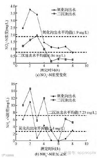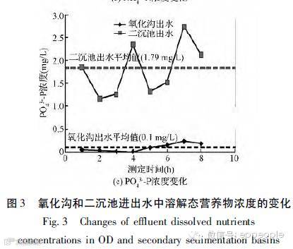 根据氧化沟沿程DO 测定可知,现有氧化沟出口处已降低到0. 5 mg /L 以下,不利于在氧化沟好氧聚磷和氨氮的硝化,该结果不符合氧化沟好氧末端出水的设计思想( 一般氧化沟是好氧末端出水( GB18918-2002) ) ,并且在实际水质监测中发现,因缺氧导致二沉池中氮磷释放量明显,故可在氧化沟出水口前段的廊道内增设曝气盘( 图5( b) ) ,增加好氧区的容积,保证氧的持续供给,且可使氧化沟出水中DO 浓度在0. 5 mg /L 以上,通过对改造后的氧化沟系统进行抽样检测,在系统稳定运行下,氧化沟出水NO -3 -N、NH +4 -N 和PO3 -4 -P 浓度平均值依次为7. 2、1. 6 和0. 7 mg /L,而其相应的二沉池出水的NO -3 -N、NH +4 -N 和PO3 -4 -P 浓度平均值依次为6. 3、1. 5和0. 5 mg /L,明显抑制氮磷在二沉池中的释放,二沉池出水水质有所改善。建议活性污泥脱氮除磷工艺生物反应阶段,其出水口应在好氧段,以确保二沉池脱氮除磷效果。