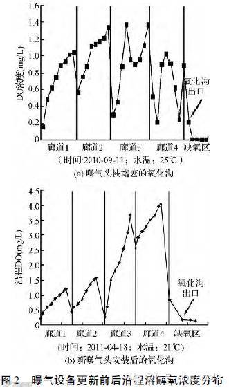 依据实际氧化沟运行状态的监测结果,提出了通过扩大氧化沟分区提高曝气效果、增加好氧区容积来改善二沉池工作状态和改进进水方式提高运行效率3 条途径。