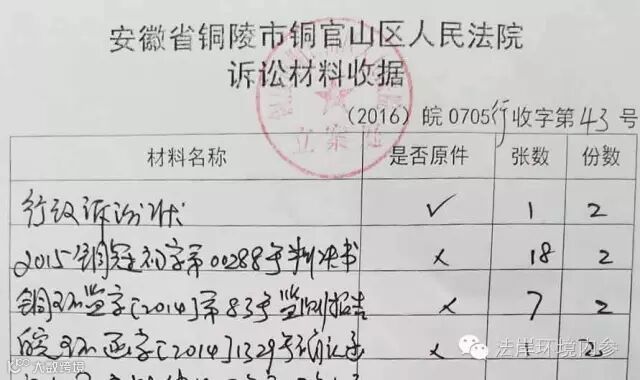 昨天,铜陵有色金属集团铜冠新技术有限公司,分为两个行政诉状案件,把铜陵市环境监察支队和铜陵市环境监测中心站诉到了铜陵市铜官山区人民法院。铜陵市铜官山区人民法院向案件原告当场出具了收到诉讼材料的收据,然后将根据法律规定的期限决定是否立案。