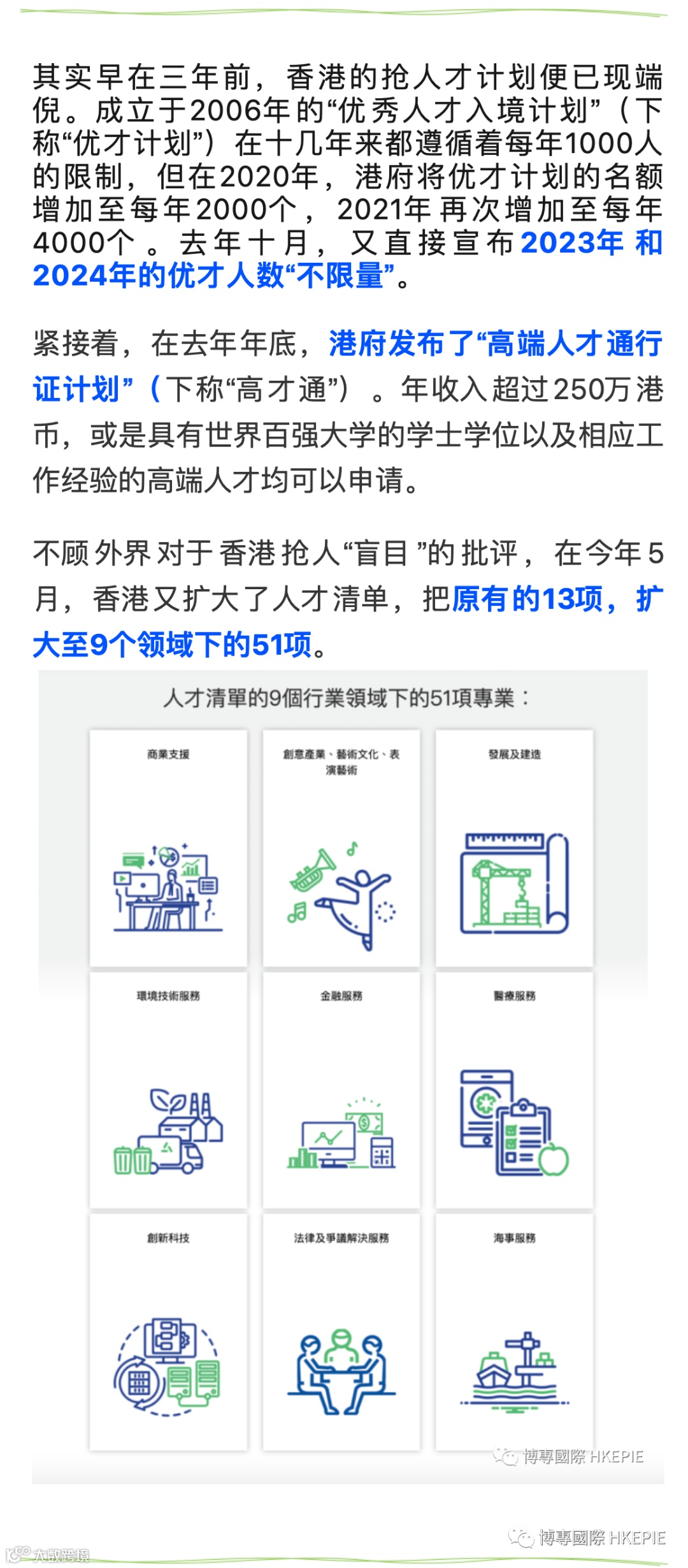上个月,香港特首李家超对媒体披露,截至今年6月底,“高才通”等各项人才输入计划已经接到了超过十万份申请,已经批准的签证超过6万份,已经远超过每年引进3.5万人的目标。李家超还表示,按照目前的趋势,到今年年底,有望通过十万份申请。