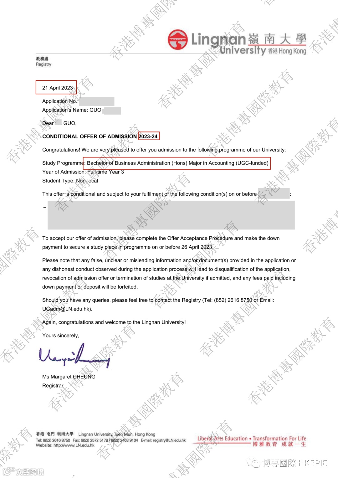 最终,我于毕业前收到了岭南大学工商管理( 荣誉) 学士课程和浸会大学国际学院的会计学商学士(荣誉)学位的录取通知。