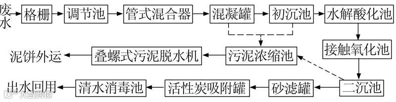 该处理工艺主要由预处理单元、混凝沉淀单元、生物处理单元、深度处理单元、污泥处理单元组成。