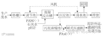 该生产废水由格栅进入调节池,池内设曝气装置,对污水进行充分曝气,使Fe2+转化为Fe3+。因废水呈酸性,所以调节池设计为钢筋混凝土加防腐结构,池顶加盖。废水由调节池经提升泵进入混凝反应槽,通过机械搅拌,与加入的石灰水及阴离子型PAM充分混合反应。