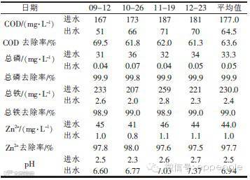 该工艺对总磷、总铁和Zn2+的平均去除率分别为99.9%、99.0%和97.7%,但对COD的去除率仅为63.6%,主要是因为该废水的COD较其他同类废水偏低,工艺设计时COD的去除并非主要考虑因素,但出水COD仍能达到《污水综合排放标准》(GB 8978-1996)中的一级排放标准要求。