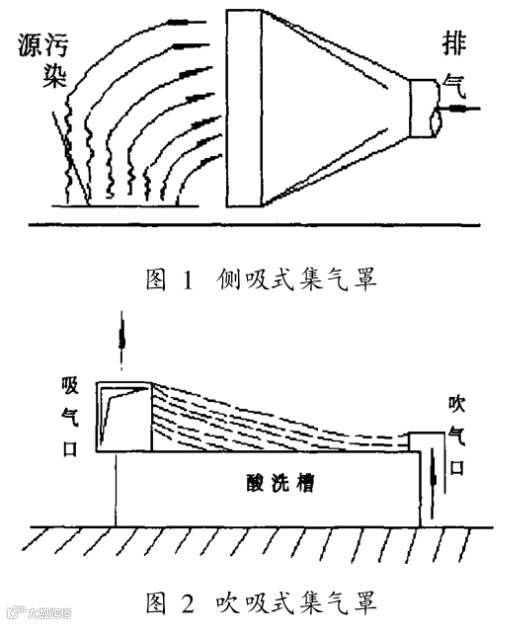 污染物捕集装置按气流流动的方式分为两大类:吹吸式捕集装置和吸气捕集装置。