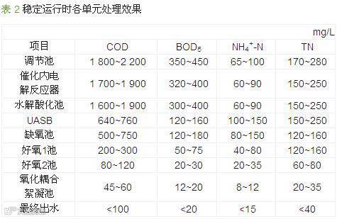 由上述可知,催化内电解工艺/水解酸化/UASB/AO/氧化耦合絮凝工艺具有较强的抗冲击负荷能力,但由于牛磺酸生产废水水质水量的多变性,如果要求牛磺酸生产废水能够得到有效的处理,稳定运行至关重要。结合长期运行参数,当进水COD不高于2 000mg/L、氨氮不高于80 mg/L时,各工段稳定运行参数如表2所示。