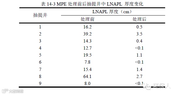 10) 修复效果:在25d的运行时间内,多相抽提系统从9口井中总共抽出约720升流体(LNAPL和部分受污染的地下水),通过不同方式总共去除甲苯污染物约125kg。中试前后LNAPL厚度变化见表14-3。单个抽提井中甲苯平均去除速率约为1.75千克/小时。甲苯大部分以LNAPL形式去除。由中试运行结果可知,多相抽提装置对场地LNAPL污染物的去除有较好的效果。多相抽提系统的抽提影响半径约6.0m,系统运行过程中场地的地下水水位与系统运行前相比略有下降。由于中试工程在25天内已取得了较好的修复效果,因此,可以预期在2年内利用该技术可将该污染场地地下水中甲苯的浓度降至饱和溶解度的1%以下,即无LNAPL存在,并达到修复目标。