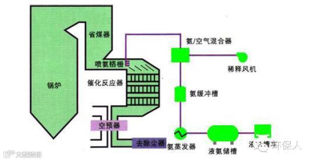 素作为还原剂,制取氨气并经空气稀释,与烟气均匀混合后由喷氨格栅送入布置在省煤器与空气预热器之间的SCR脱硝反应器,在反应器催化剂层中还原剂与烟气中的氮氧化物发生氧化还原反应生成氮气和水蒸气,达到脱除氮氧化物的目的。通常设计脱硝效率80%~90%,可达95%以上。为保证高效脱硝,可采用烟气均流优化工艺及设备来保证烟气和氨的充分均匀混合。系统单位投资一般单位投资约100~230元/kW;运行成本一般低于1.2分/kWh。