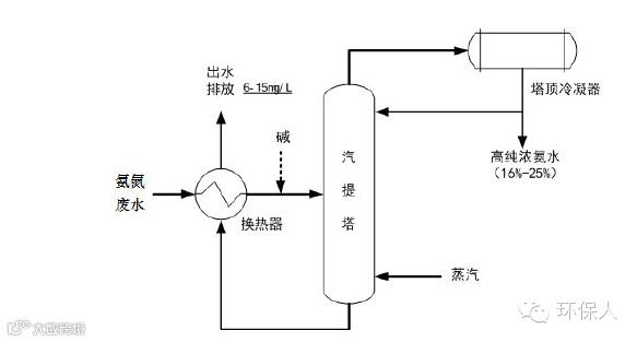 基于氨与水分子相对挥发度的差异,通过氨-水的气液平衡、金属-氨的络合-解络合反应平衡、金属氢氧化物的沉淀溶解平衡的热力学计算,在汽提精馏脱氨塔内通过数十次气液平衡将氨氮以分子氨的形式从水中分离,然后以氨水或液氨的形式从塔顶排出,并被冷凝器冷却到常温成为高纯氨水进行回收;在塔底得到较纯净的处理出水。