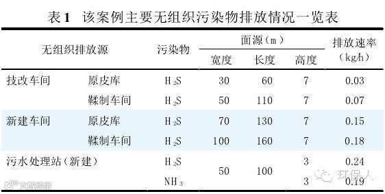 但随着社会经济发展,A行政村向南扩展,即使新的皮革行业卫生防护距离标准较老标准的防护距离减少100 m,本项目现有工程仍不能满足卫生防护距离标准的要求。因此,该项目改扩建过程中,大气防护距离将会是限制企业改扩建的重要因素。改扩建完成后项目主要无组织污染物排放情况见表1。
