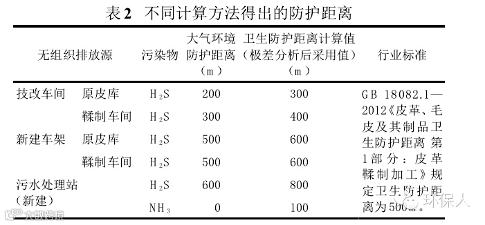 根据上述案例,经计算或查阅皮革行业标准得到相应大气环境防护距离和卫生防护距离数值,见表2。