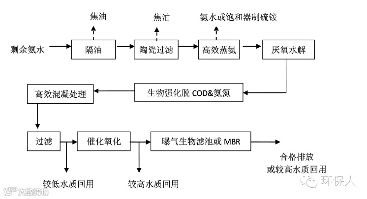 【技术内容】煤化工剩余氨水经气浮脱油,陶瓷膜过滤脱油,萃取脱酚/高效蒸氨后回收有价组分后经厌氧水解后强化生物脱碳脱氮,混凝处理后过滤,高级氧化处理后经曝气生物滤池,实现合格排放或者较高水质回用。