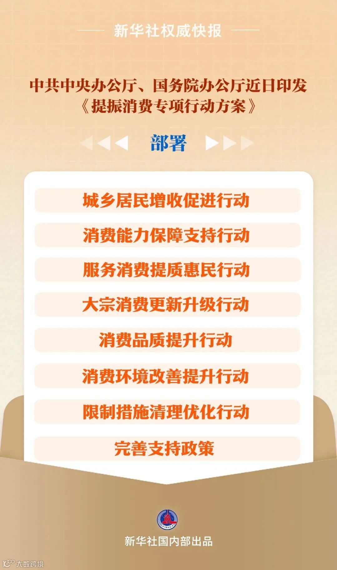 近日,中共中央办公厅、国务院办公厅印发《提振消费专项行动方案》,要点梳理如下↓
