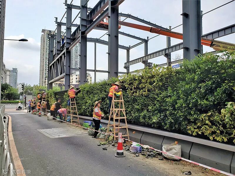 在围蔽建设中,项目部采用了绿植围蔽的方法,将围蔽制作成可以摆放盆栽的铁架,采购了鲜活绿植按照不同图案进行排放,并安排专人定期维护管理,形成了一道绿色的风景线。