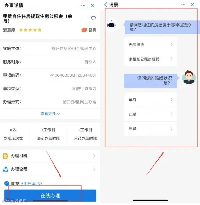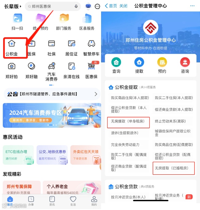 进入郑好办APP,点击选择“公积金”选项,进入后根据个人情况可选择“无房提取(单身租房)”或“无房提取(已婚租房)”