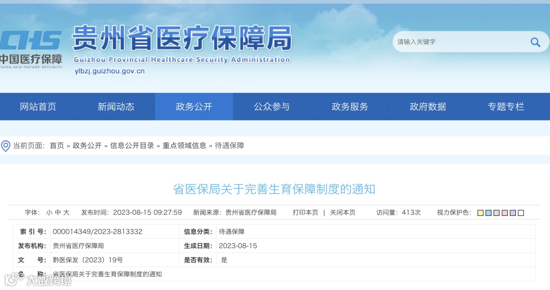2023年8月15日,贵州省医保局发布了《省医保局关于完善生育保障制度的通知》,该通知自2023年10月1日正式执行。
