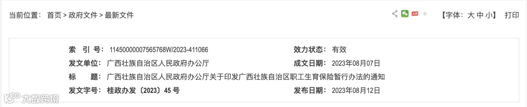 2023年8月,广西壮族自治区人民政府办公厅印发《广西壮族自治区职工生育保险暂行办法》,该《办法》自2023年9月1日正式执行。