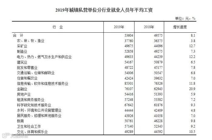 2019年城镇私营单位分行业就业人员年平均工资。来自国家统计局