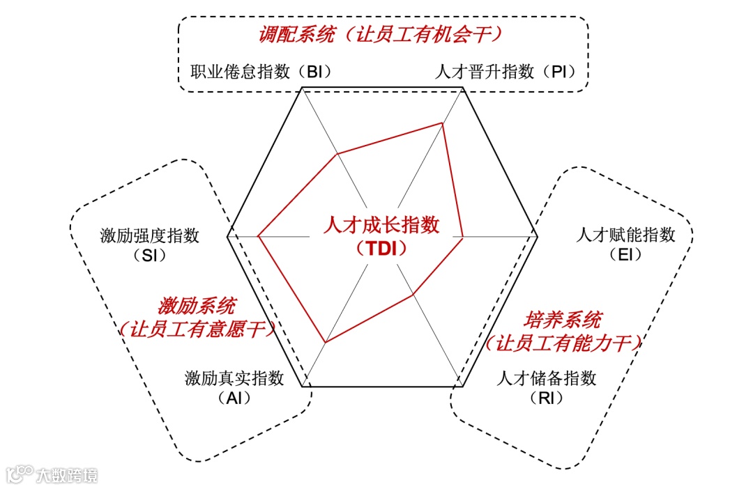 还是用数据说话。通过定义一个“人才成长指数(Talent Development Index, TDI)”,以人才成长的状态为标准,衡量了企业的人力资源管理水平,也就是选用育留等职能运行的水平。具体来说,TDI由六个变量决定: