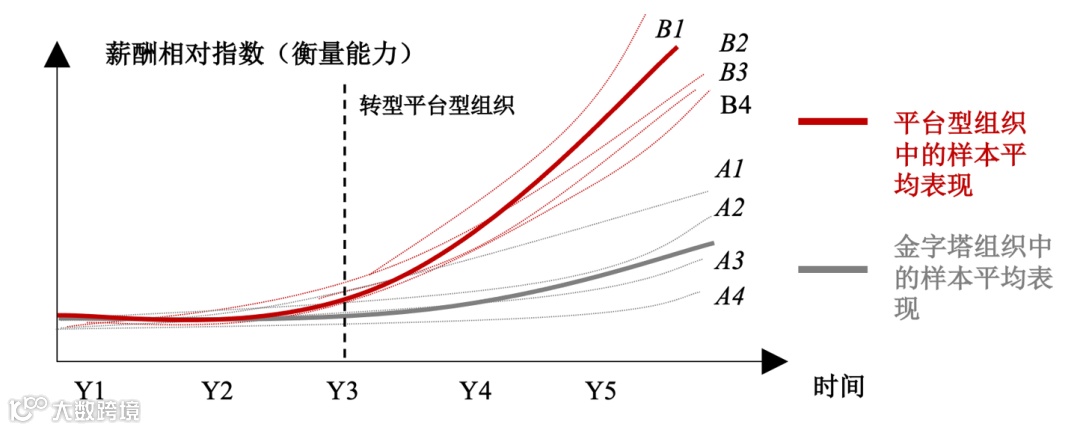 在指标上,以薪酬相对指数来衡量成长,即个人薪酬相对于企业平均薪酬的比值,这应该是比较公允的。在样本上,选择了四组数据进行对比,前台两组,中台和后台各一组,这样一来也比较全面。最后发现,在B企业转型平台型组织后,各类人才的成长速度提升非常明显,平均达到了A企业的3倍。这个结果已经很明显地说明了问题。