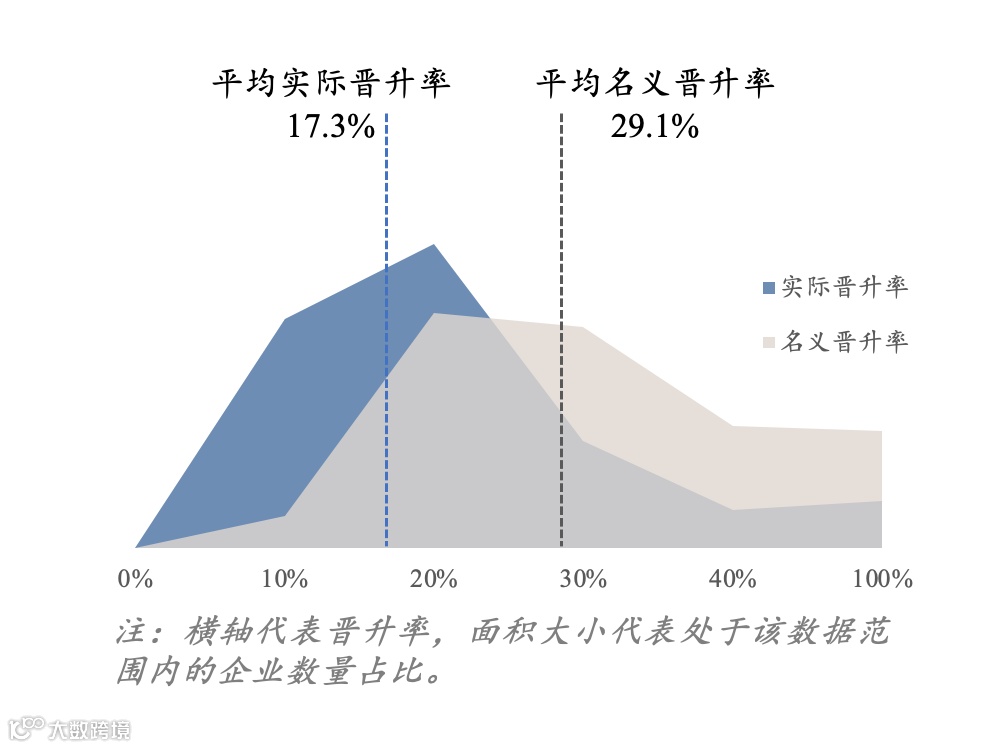 数据显示,样本企业的平均名义晋升率为29.1%,而平均实际晋升率17.3%,中间有11.8%。这是一个非常夸张的数字,说直白点,企业在对于员工的晋升承诺上,画了约1/3的“大饼”。企业当然可以用各种理由告诉员工个体,你为什么没有晋升上去,但是,总的数据结果的确有点说不过去。