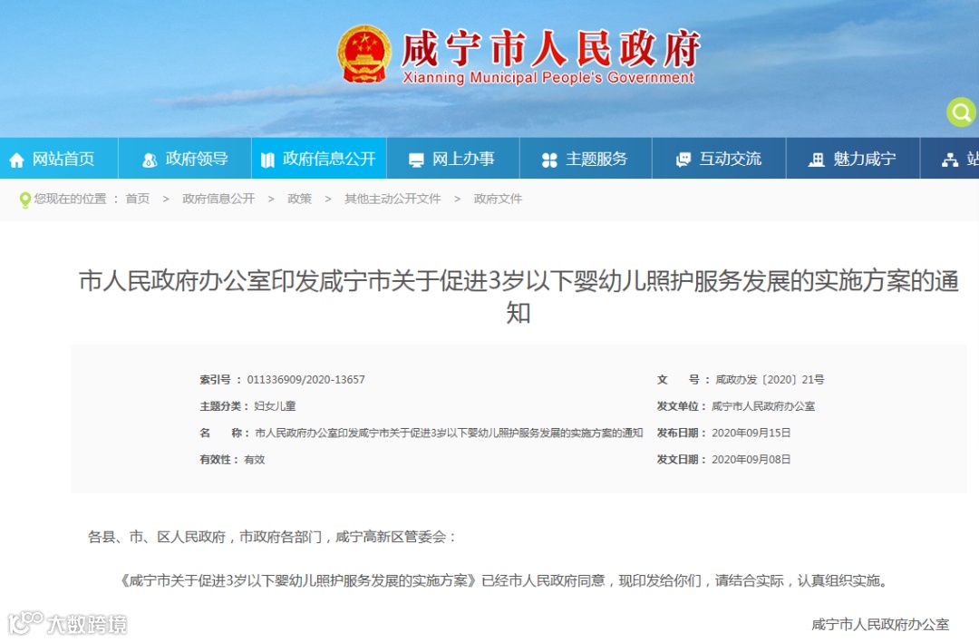 9月15日,湖北省咸宁市发布《咸宁市关于促进3岁以下婴幼儿照护服务发展的实施方案》——