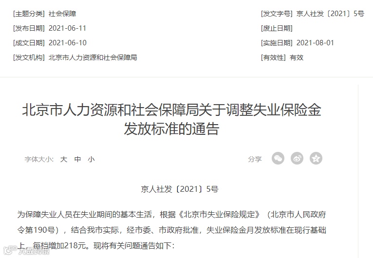 今年6月11日,北京人社局发布了《关于调整失业保险金发放标准的通告》,其中规定8月1日起,失业保险金月发放标准每档增加218元。