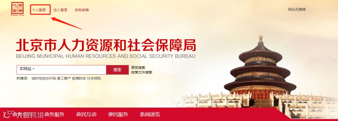 方法2:点击进入入口2,登录“北京市人力资源和社会保障局”官网,点击“个人登录”。完成北京市统一身份认证平台“身份认证”