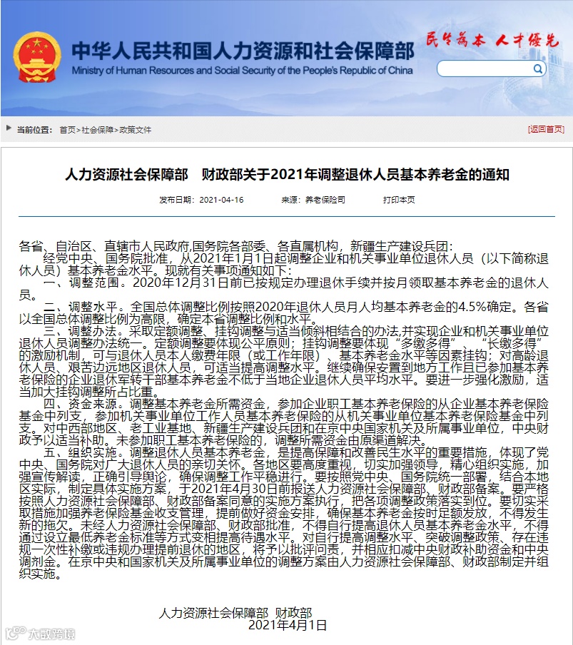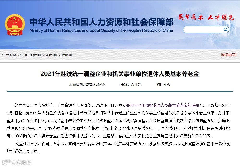 经党中央、国务院批准,人社部、财政部近日印发《关于2021年调整退休人员基本养老金的通知》,明确从2021年1月1日起,为2020年底前已按规定办理退休手续并按月领取基本养老金的企业和机关事业单位退休人员提高基本养老金水平,总体调整水平为2020年退休人员月人均基本养老金的4.5%。