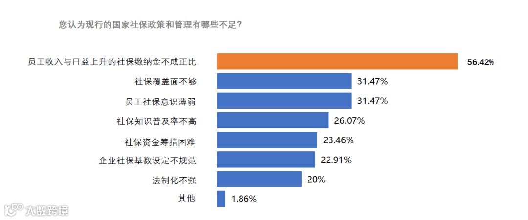 可以看到,大部分企业人力资源从业者都能认识到当前人力成本上升与人才需求增长之间的矛盾。一方面人才是企业发展最重要的元素之一,但另一方面高素质人才往往意味着要付出更加高昂的人力资源支出。在平衡矛盾的过程中,企业往往会忽视人才的收入问题或是从先前的社保“洼地”入手,降低员工的社保基数。但在国家规范化社保运营后,这些手段变得不复存在。调研数据显示,有56.4%的企业人力资源从业者认为“员工收入与日益上升的社保缴纳金不成正比”是当前困扰企业HR和企业员工的最大问题。