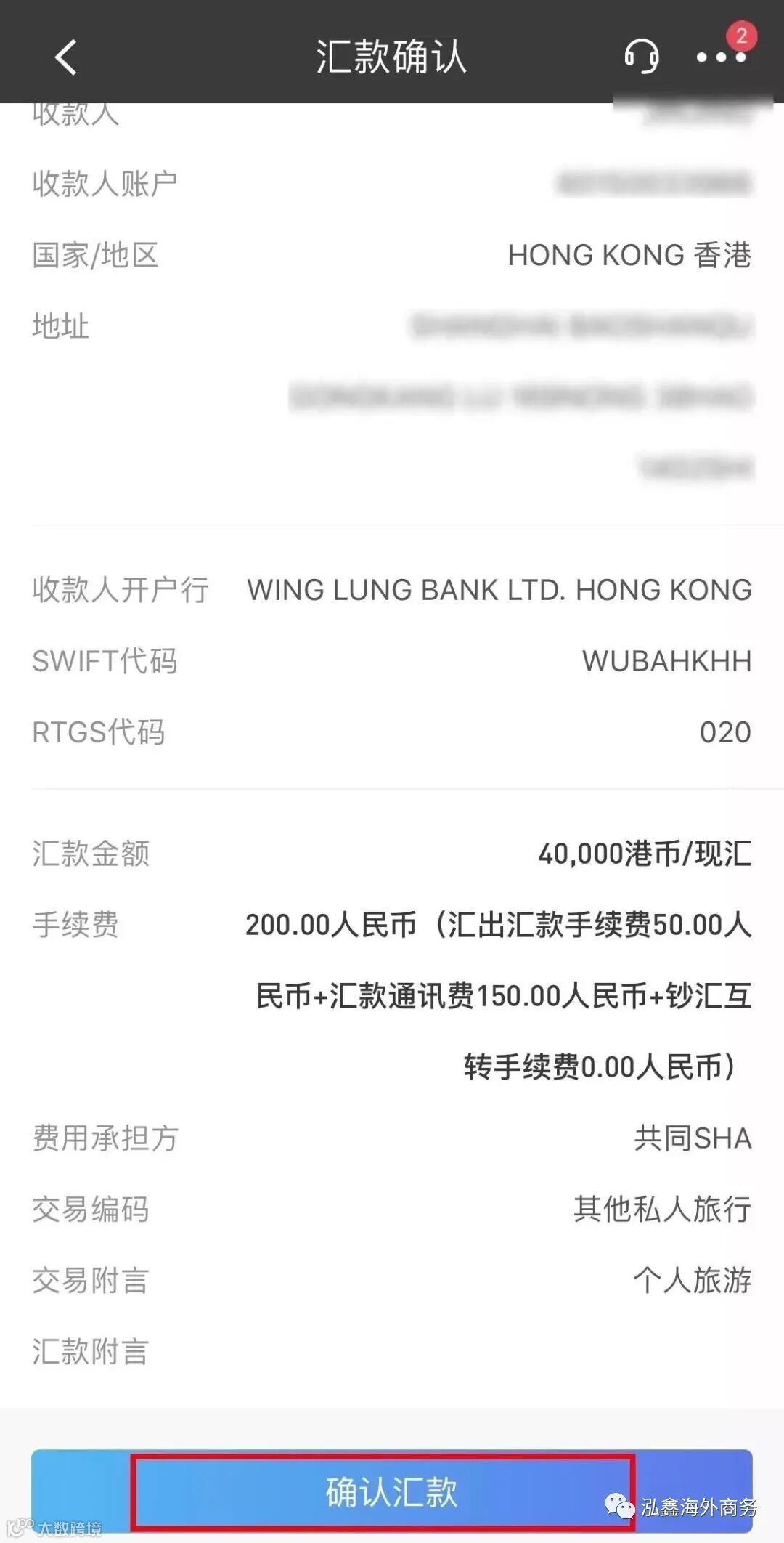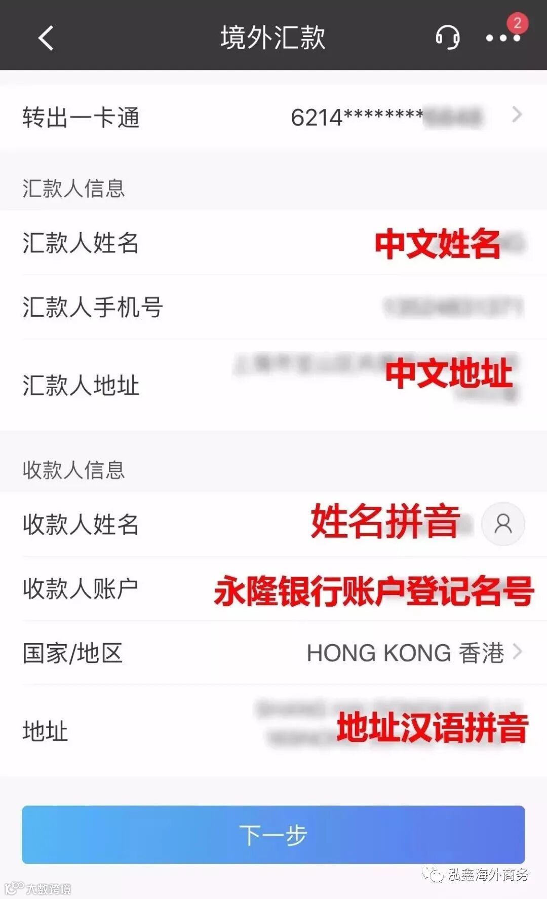 注意:收款人信息中,需要填写拼音姓名,香港卡号及拼音地址;香港银行卡包含很多帐户,美元户,港币户,澳元户,欧元户,日元户等等,我们需要转什么币种,就填写那个币种帐户。