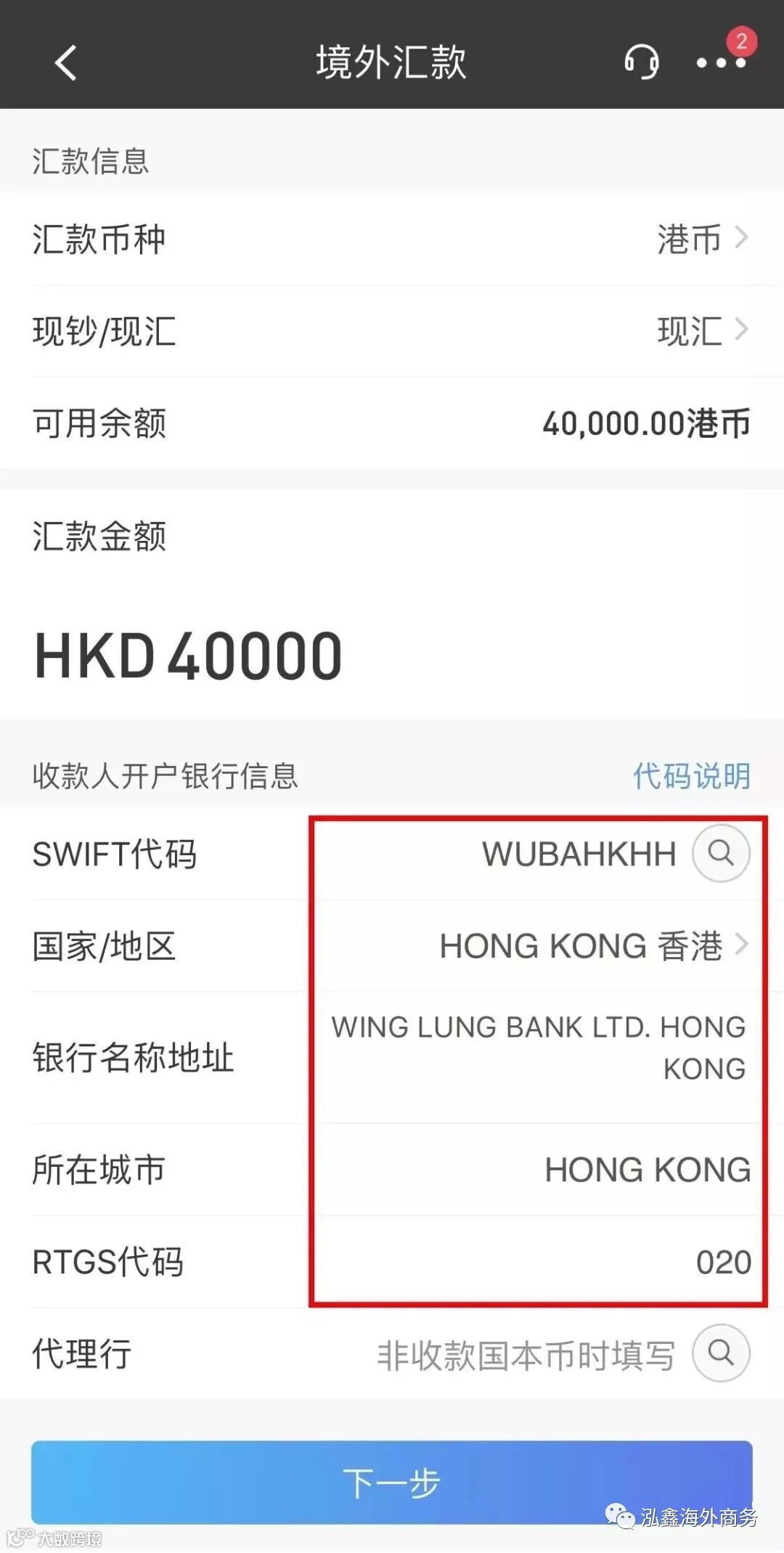 4.输入汇款金额及SWIFT编码,进行下一步(银行名称地址将自动显示)