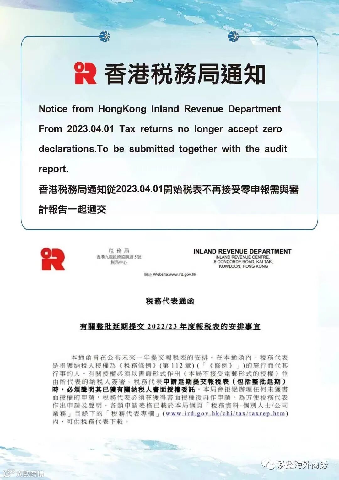 根据香港税务局的通知,自2023年4月1日开始,所有香港公司下来的利得税表必须连同审计报告一起递交税务局,不可以只是利得税表零申报递交税务局。