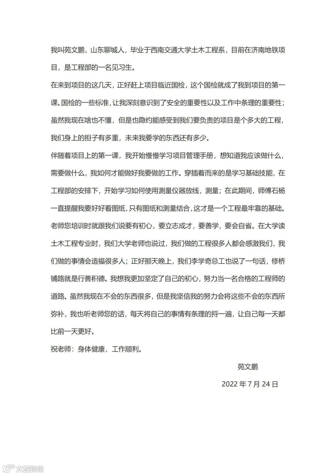 入职培训第一课,刘伟书记对新员工提出殷切希望:“要有初心,要立志成才,要善学,要会自省”。台下的苑文鹏将这句话认认真真记在了本子上。得知自己的职业导师是刘伟书记时,苑文鹏内心是略有些忐忑的,担心书记严要求、高标准,自己作为新人进步不够快,会辜负师父的厚望;又担心“距离感”,由于项目部距离总部很远,苑文鹏与刘伟师父不常见面,上下级关系也容易产生心理隔阂……