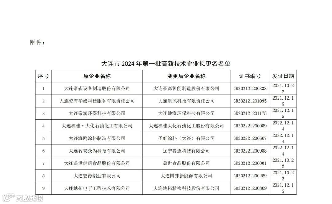 关于公示大连市2024年第一批拟更名高新技术企业名单的通知