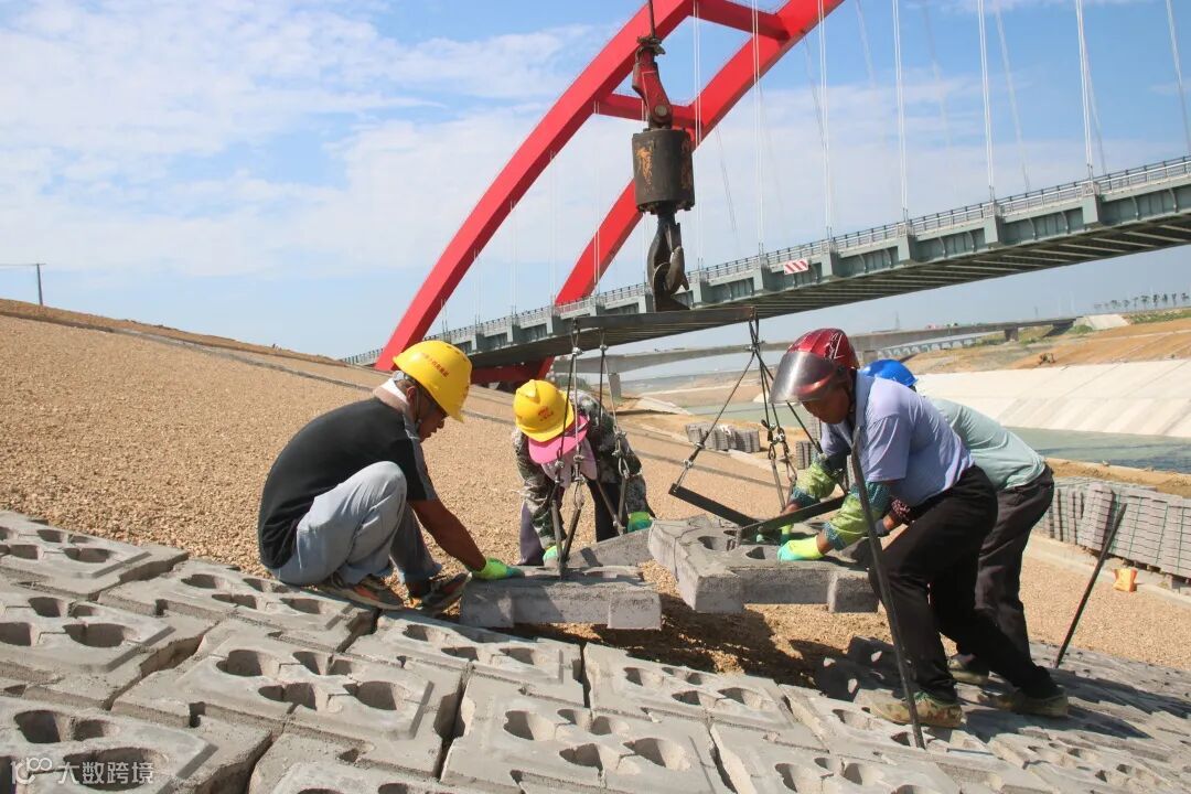 酷暑之下,引江济淮的工人们顶着烈日进行连锁预制块铺设。(拍摄:王佳豪)