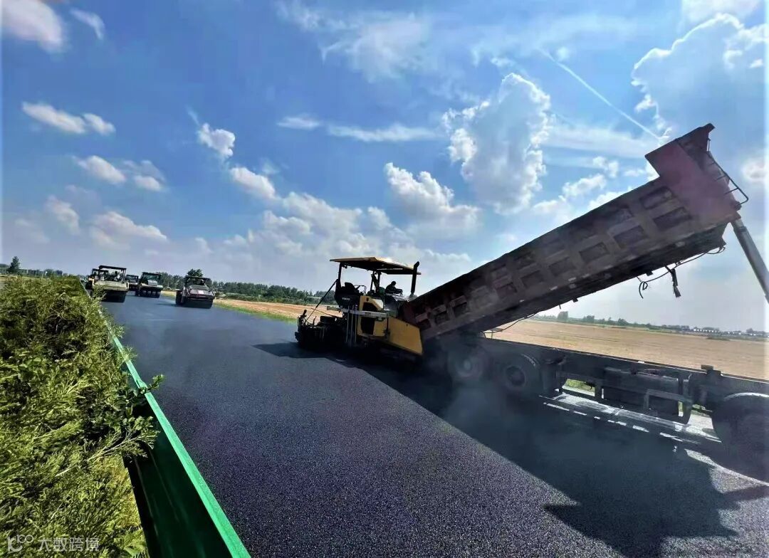强烈的日光下是常人难以忍受的温度,阜阳102省道正在进行枣庄至插花沥青上层摊铺。(拍摄:张诚)