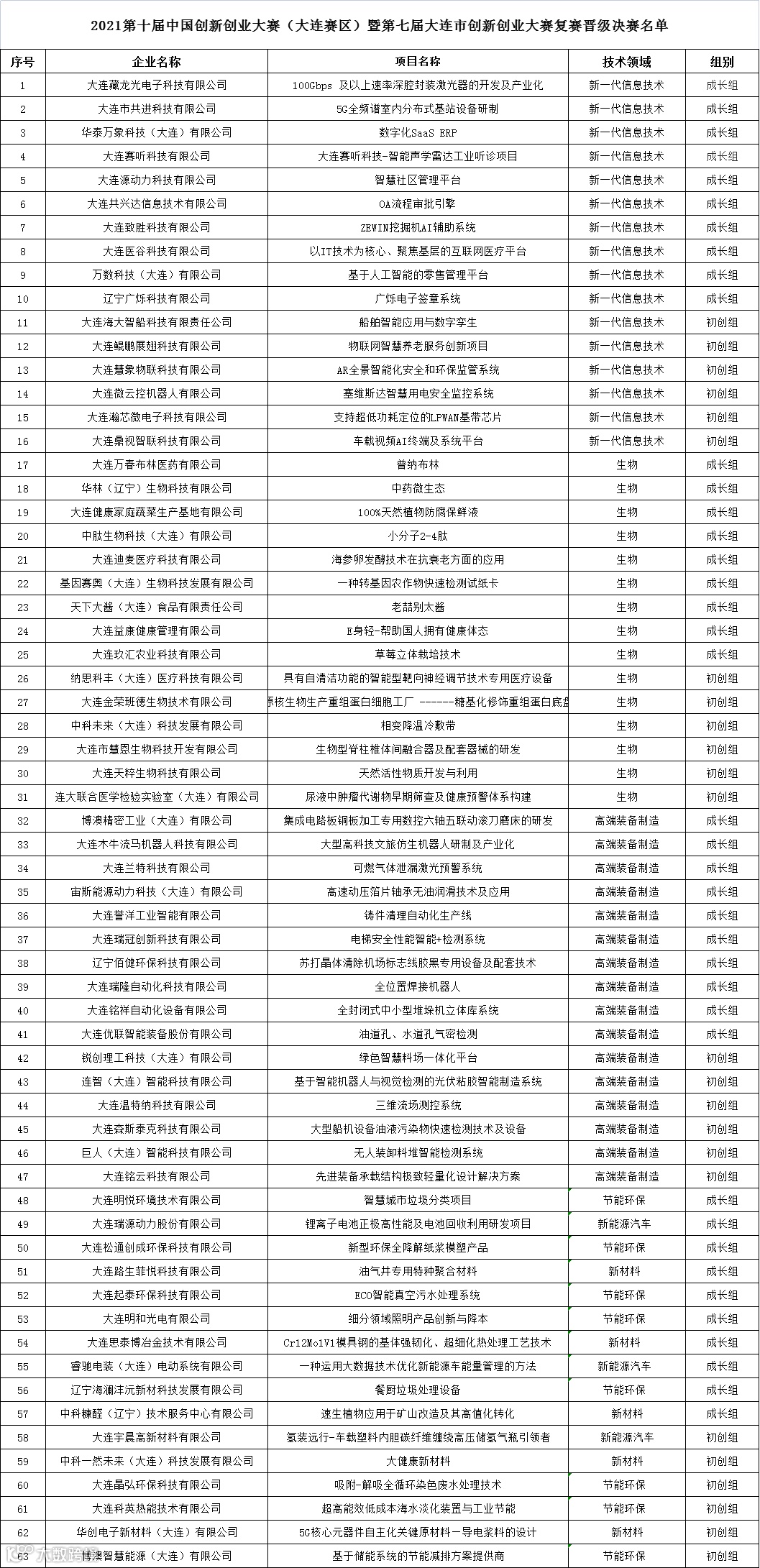 2021第十届中国创新创业大赛(大连赛区)暨第七届大连市创新创业大赛复赛工作已完成,现将晋级决赛名单予以公示。