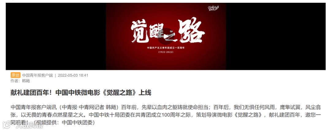 5月3日,由三建公司组织青年员工自主创作并参与录制的建团百年微电影《觉醒之路》在中国青年报客户端、中国共青团杂志视频号、安徽卫视、中安在线、中国中铁青年视频号等媒体平台发布。