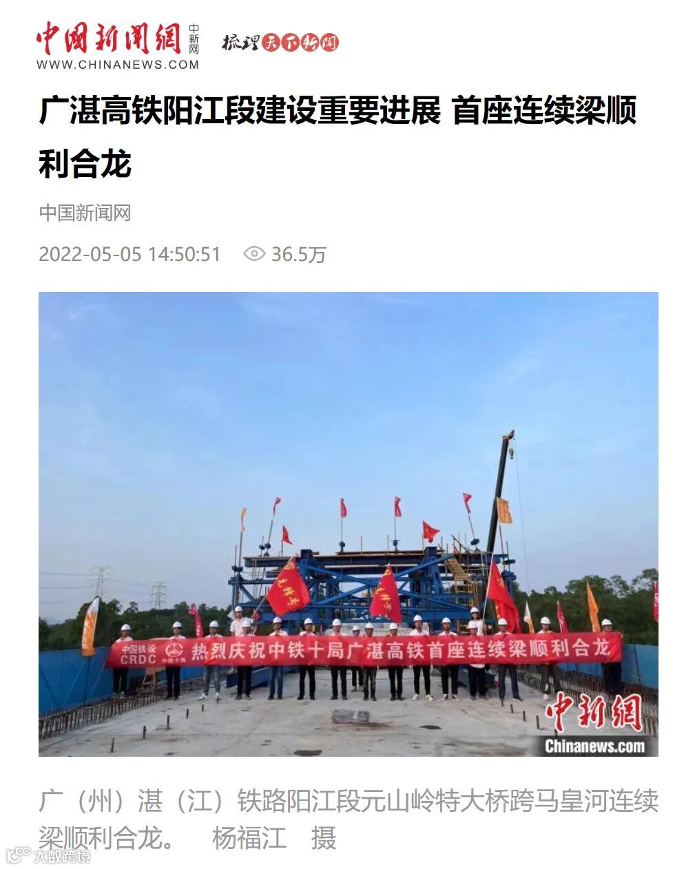 5月5日,广湛铁路七标段元山岭特大桥连续梁合龙在中国新闻网、南方都市报、南方+、阳江电视台等媒体平台发布。