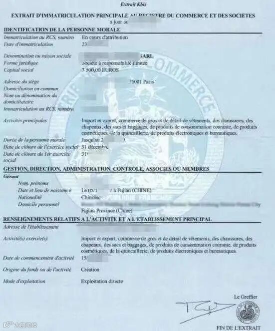 法国商业局将对提交的资料进行审核。审核通过后,收取营业执照(KBIS);