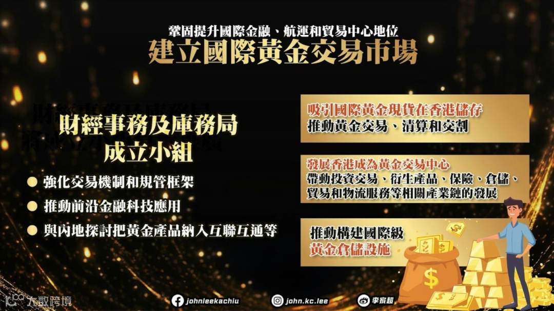 李家超发表施政报告称,将香港打造成为国际黄金交易中心,促进投资交易、衍生产品、保险、仓储、贸易和物流服务等相关产业链发展。特区政府会推动构建国际级黄金仓储设施,拓展在港存放和交割实金服务,带动抵押和借用等衍生金融服务,为金融业开创新增长点。