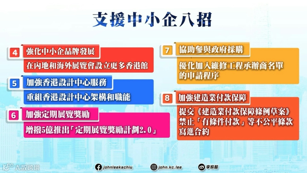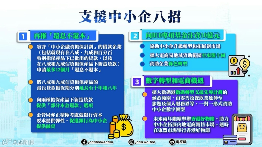 本次《施政报告》提到了一系列企业利好,针对中小企在经济转型期常遇到的挑战,政府会推出一系列支援措施,包括再推“还息不还本”、向“BUD专项基金”注资10亿元、支持数字转型和把握电商机遇等。