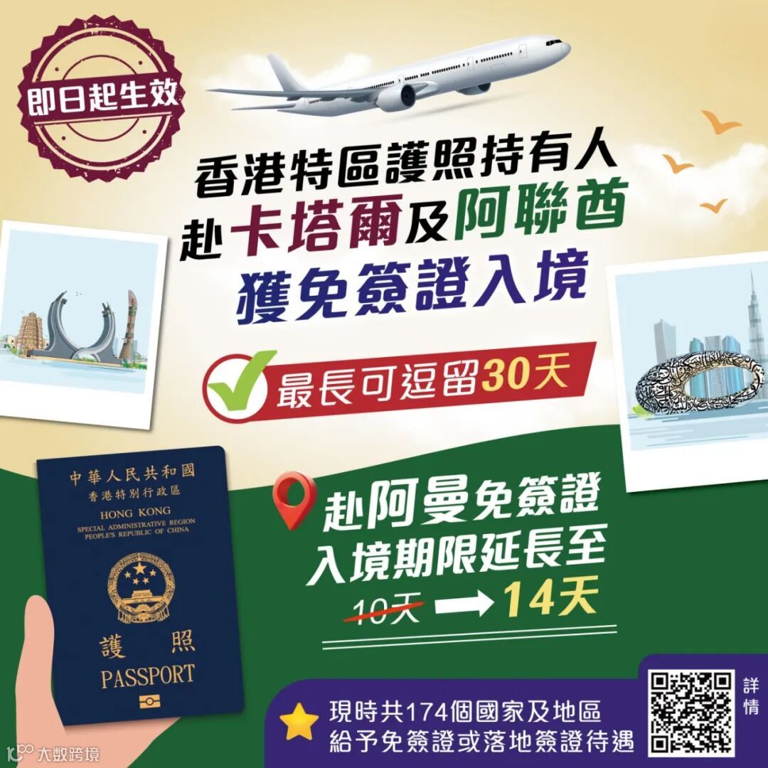 近日,港府官宣重磅消息!据香港入境事务处官网显示,香港特区护照持有人可以免签证入境卡塔尔,最长可逗留30天,香港护照免签或落地签地区增至174个,含金量越来越高了。