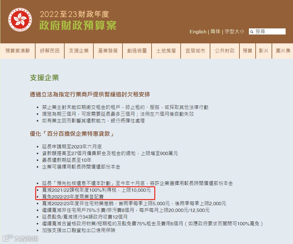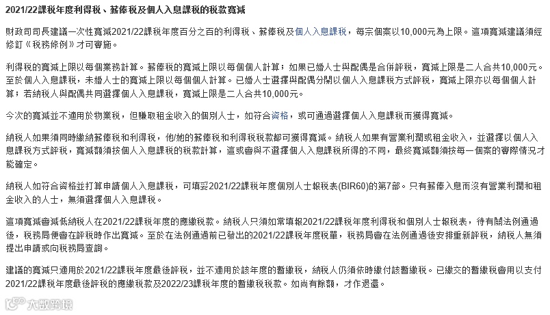 一次性宽减2021/22课税年度百分之百的利得税、薪俸税及个人入息课税,每宗个案以10,000元为上限