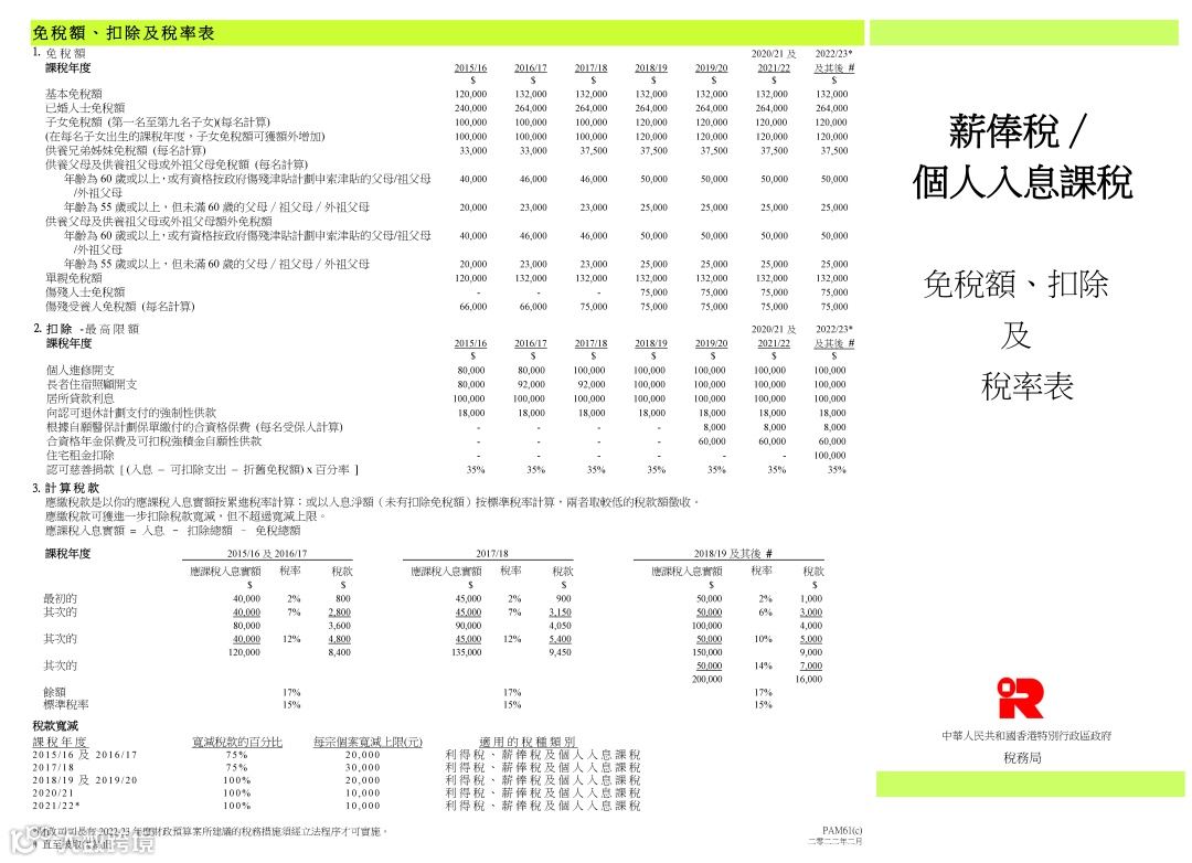 利得税的宽减上限以每个业务计算。薪俸税的宽减上限以每个个人计算;如果已婚人士与配偶是合并评税,宽减上限是二人合共10,000元。