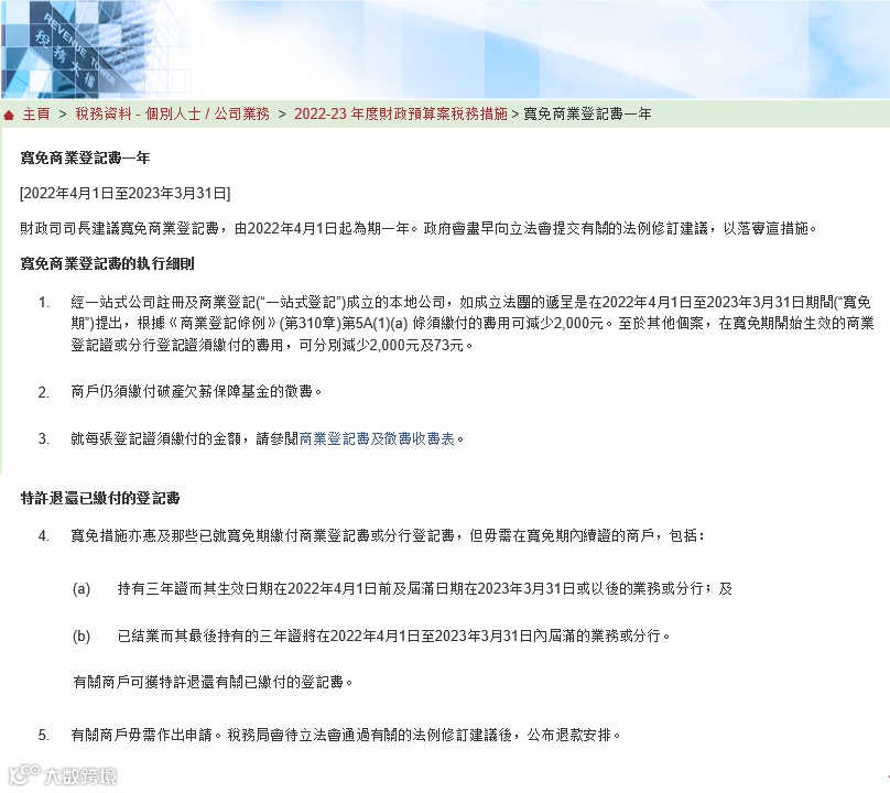 香港公司商业登记证登记费用将继续减免,如果是在2022年4月1日至2023年3月31日期间进行香港公司注册或年审,根据《商业登记条例》,须缴付的香港登记证费用可减免2,000元,只需缴付250港币即可。